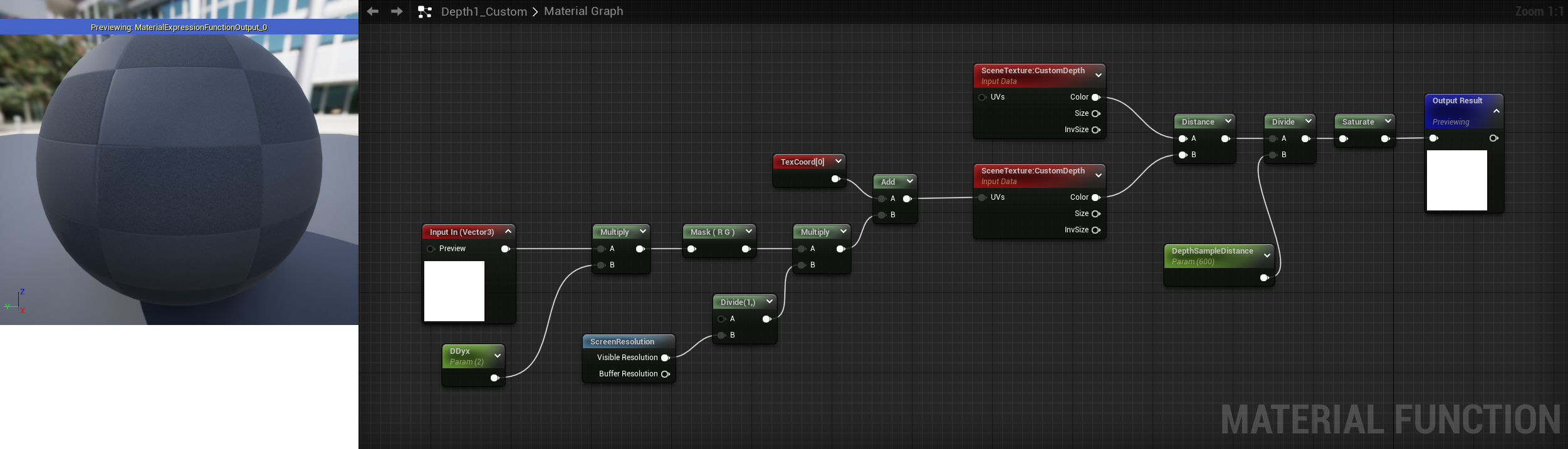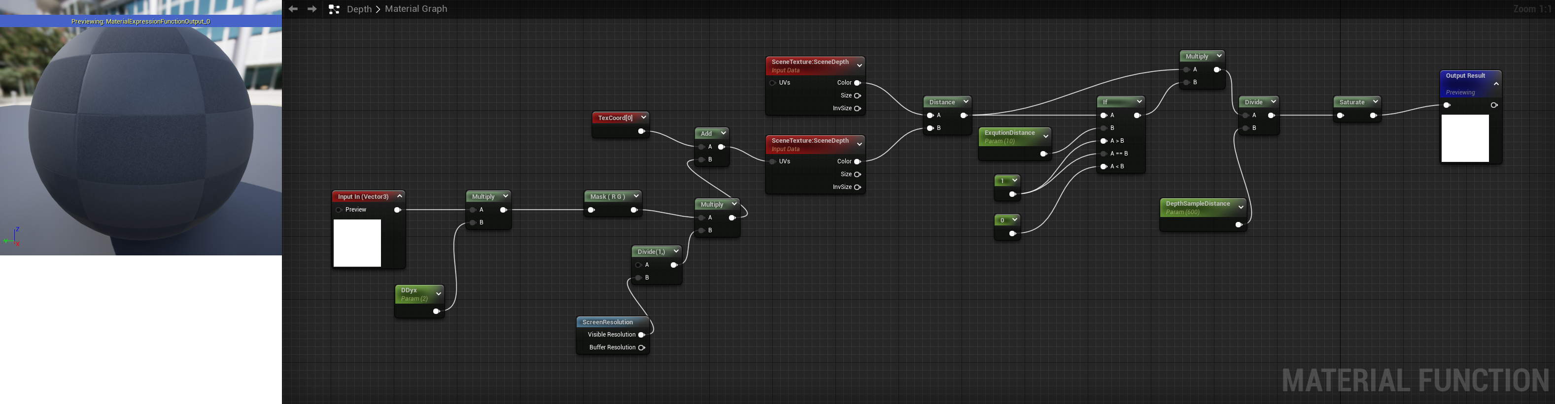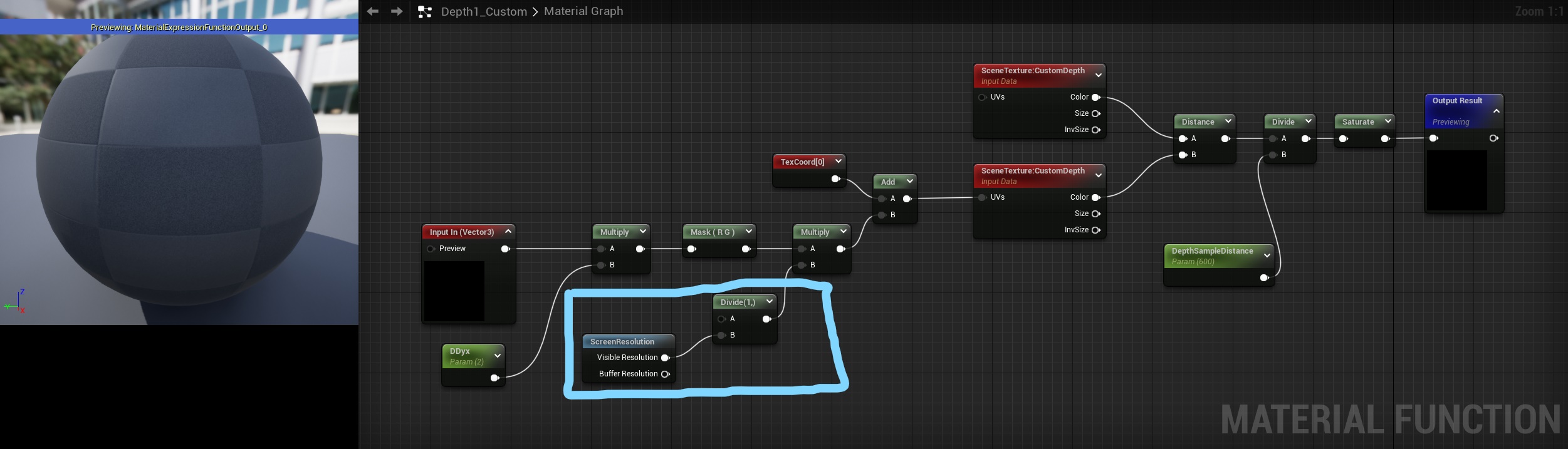由于不同的显示窗口大小不一,使的算法在读取SceneTexture时会出现bug,导致效果出现拉伸,此时将ViewSize关联进来可以解决bug
